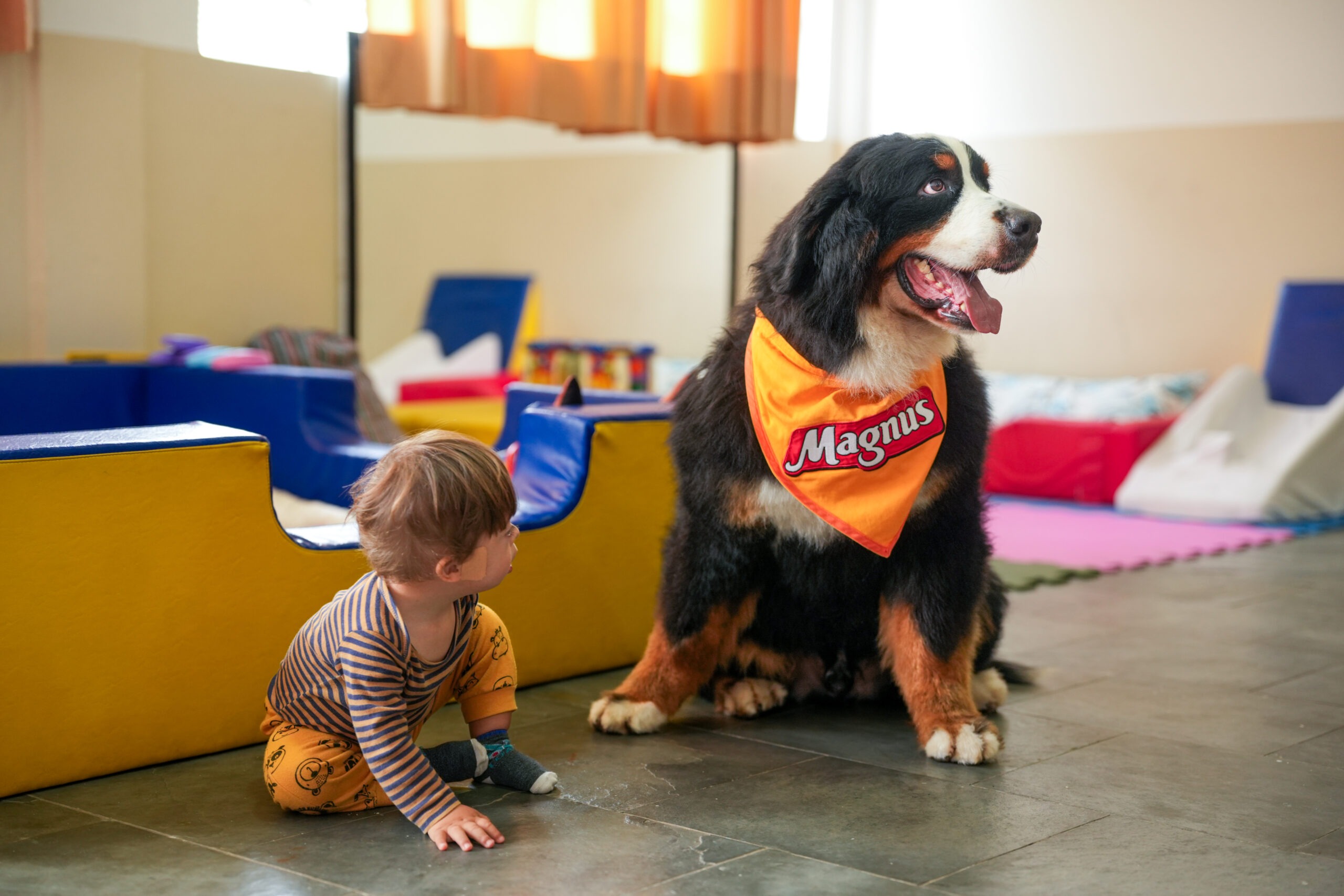 A raça do Magnus é a Bernese Mountain Dog, famosa pelo temperamento dócil e calmo, além de ser lindo! Uma combinação perfeita para levar alegria para as pessoas que precisam!
